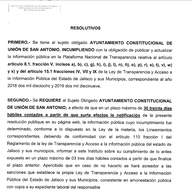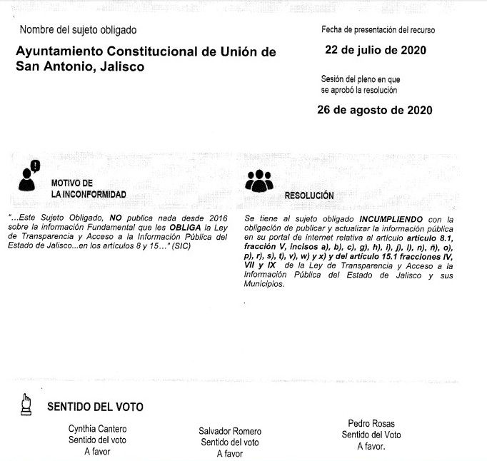 El órgano de transparencia en el estado reconoció que el Ayuntamiento unionense “incumplió la obligación establecida en el numeral 25 de la Ley de Transparencia y Acceso a la Información Pública del Estado de Jalisco y sus Municipios, consistente en publicar y actualizar de manera permanente en Internet o en otros medios de fácil acceso la información fundamental relativa al artículo 8.1 fracción V”,  y le precisa los incisos del artículo.